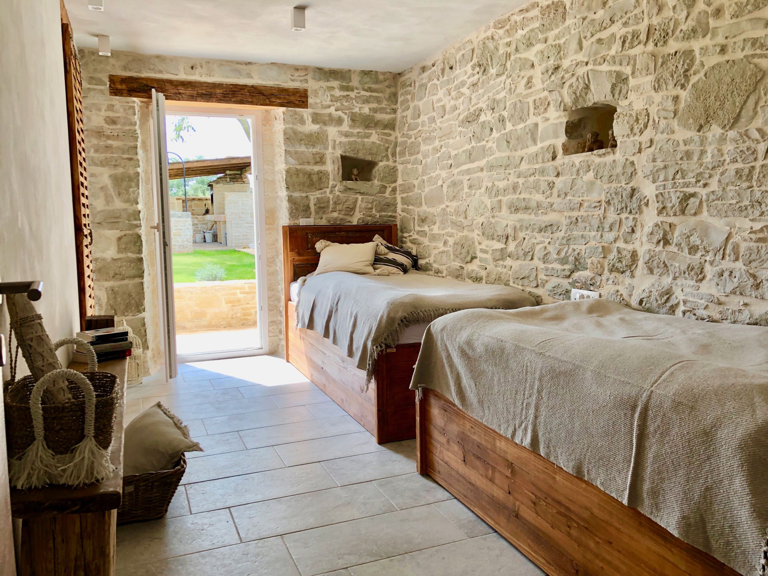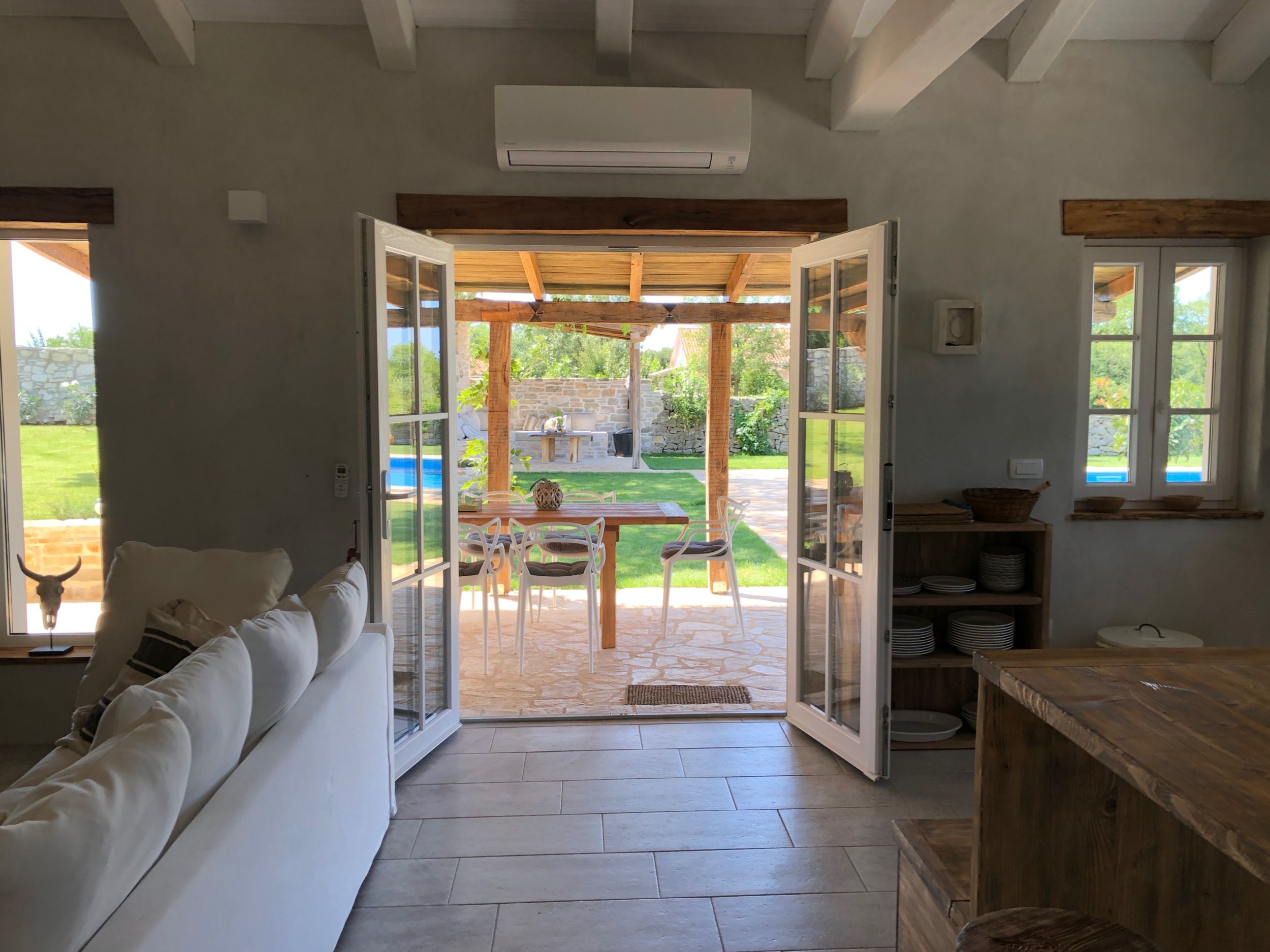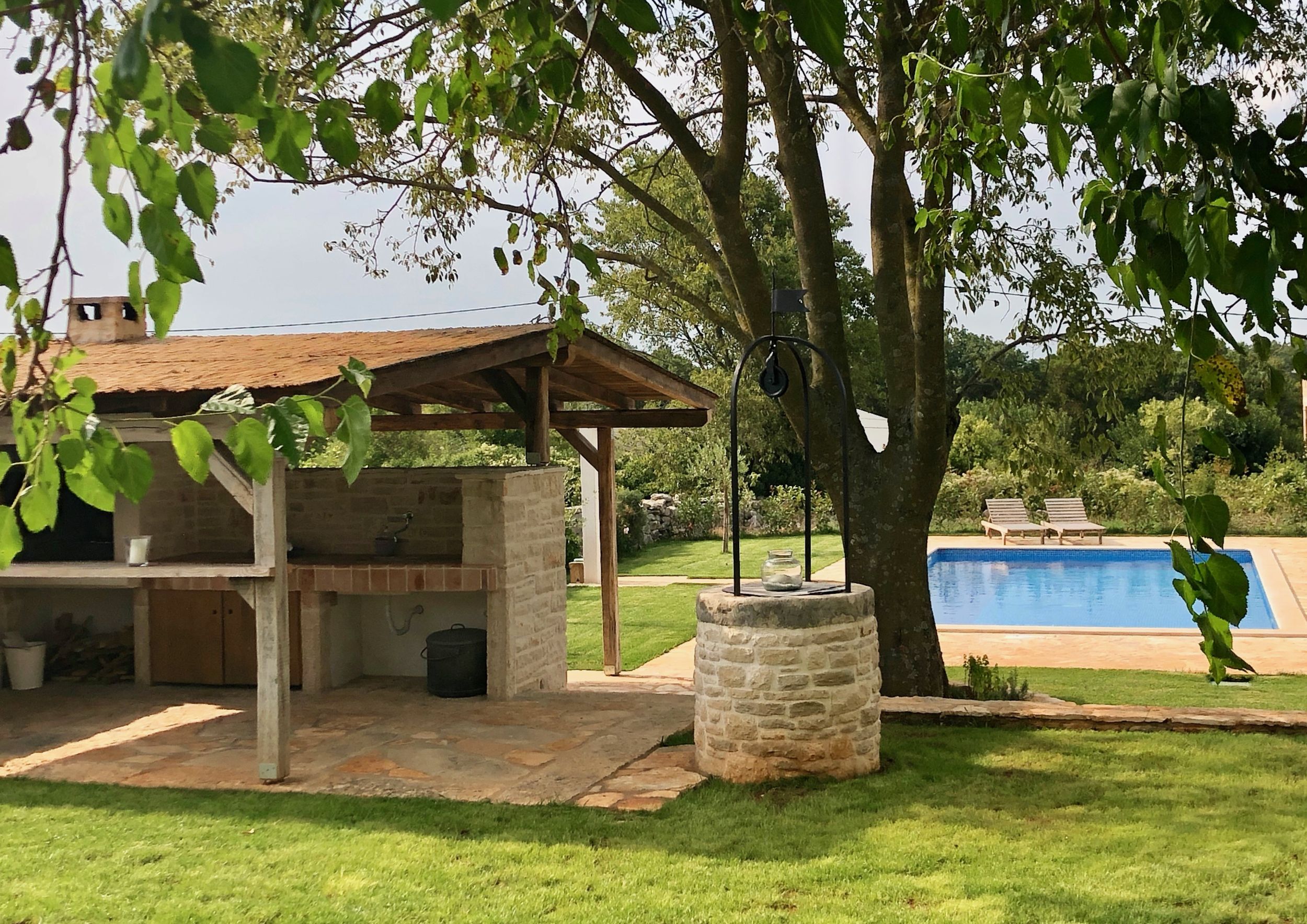 Die Luxus Villa erfüllt alle modernen Anforderungen mit einer luxuriösen Mischung aus Alt und Neu, wobei der Grundriss, die Inneneinrichtung, die sorgfältig ausgewählten Möbel und alle Details sicherlich auch den anspruchsvollsten Gast zufrieden stellen werden. Die Miet Villa Bofina bietet Platz für 8 Gäste in vier Schlafzimmer, mit zwei Bädern. Alle Schlafzimmer und Bäder befinden sich im alten Steinhaus, wobei 2 Schlafzimmer und ein Bad sich im Erdgeschosse befinden und sie die gleiche Anordnung im ersten Stock wiederfinden. Diese Einrichtung macht die Luxus Villa Bofina ideal für zwei Familien. Im Neubau befindet sich die Küche, der Esstisch und das Wohnzimmer. Vom Neubau aus gibt es einen direkten Zugang zur überdachten Terrasse mit großer Esstisch. Von der Terrasse aus blickt man auf den Garten sowei den Pool. Am großen Pool (9 x 4,5) ist eine überdachte Lounge Area und dahinter ein traditioneller Grillplatz.